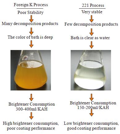221 process is the newest cyanide-free zinc plating technology, It overcomes the problem of embrittlement even in mirror bright and thicker deposits. The metal distribution and the temperature tolerance of the electrolyte are more perfect .